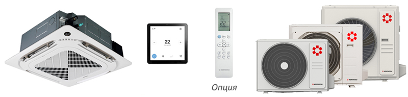 Кассетная сплит–система предназначена для установки в потолочную конструкцию скрытым или открытым способом. Подходит для офисов, кафе, ресторанов и других общественных помещений. Есть возможность организации приточной вентиляции для подмеса свежего воздуха в помещение. Кондиционер можно доработать зимним комплектом для эксплуатации в режиме охлаждения при низких уличных температурах до -40 °С.