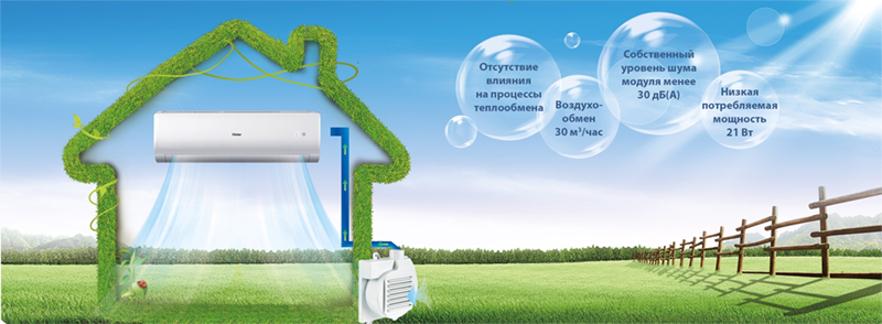 • Модуль O2 Fresh (опция) — дает приток отфильтрованного свежего наружного воздуха объемом 30 куб.м в час. Модуль крепится к стене, на которой закреплен наружный блок, либо на сам блок. Управление функцией производится с пульта ДУ.