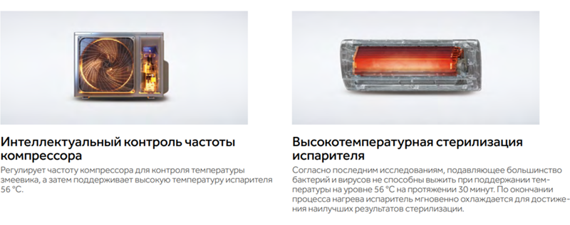 Самоочистка + стерилизация внутреннего блока обеспечивают автоматическое удаление влаги и загрязнений, предотвращают размножение бактерий и грибков, UV лампа уничтожает вирусы и микробы, а Ag+ покрытие испарителя препятствует образованию плесени и неприятного запаха, обеспечивая чистоту воздуха и продлевая срок службы устройства.