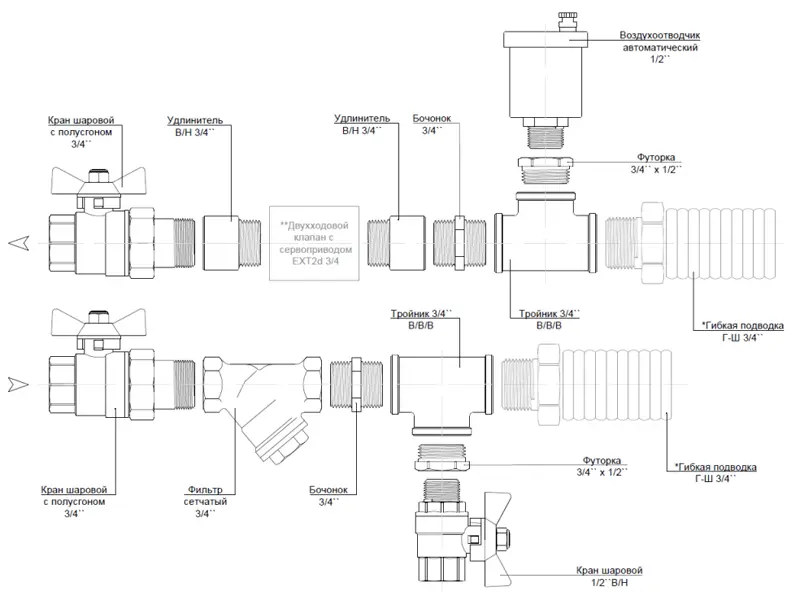 Кран шаровой с полусгоном – 2 шт. Фильтр сетчатый – 1 шт. Тройник – 2 шт. Кран шаровой (дренажный кран) – 1 шт. Бочонок (ниппель) – 2 шт. Воздухоотводчик автоматический – 1 шт. Удлинитель – 2 шт. Футорка – 2 шт.