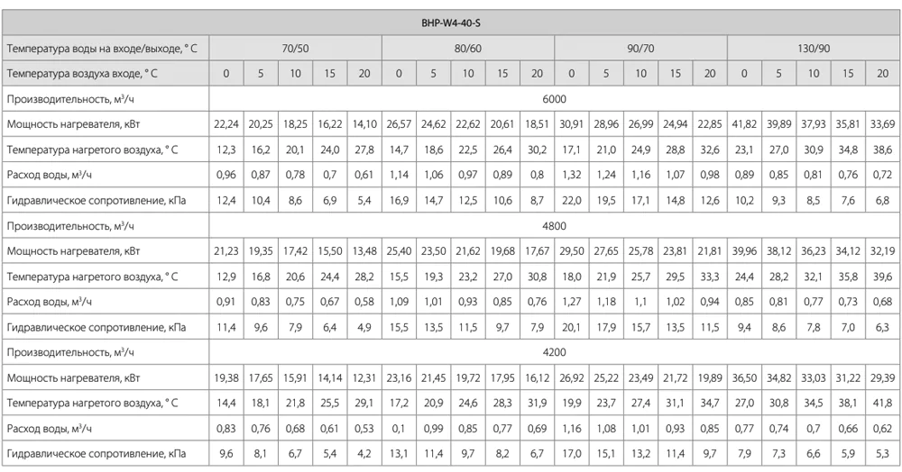 Тепловые характеристики приведены при температуре воздуха на входе +0 °С, максимальном расходе воздуха и максимальной температуре теплоносителя (указанной в таблице тепловой мощности от производителя).