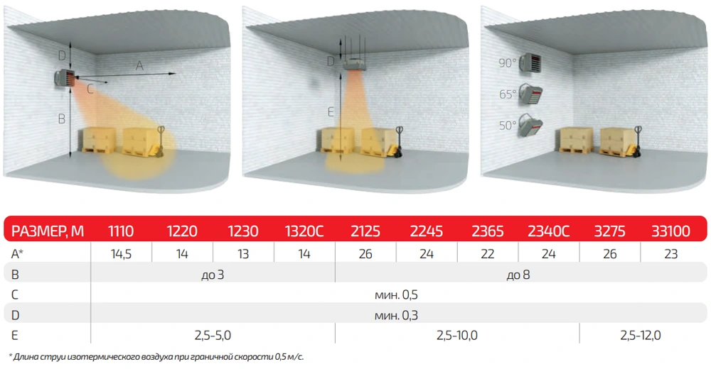 Высота монтажа при направлении нагретой струи вертикально вниз: