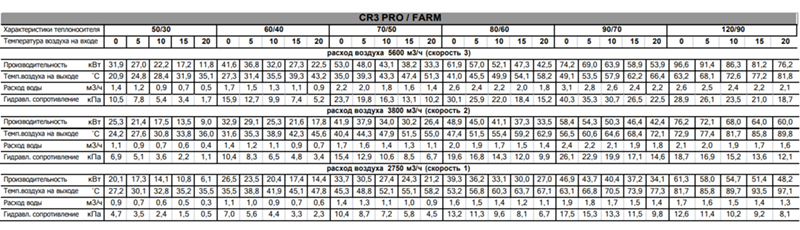 Тепловые характеристики приведены при температуре воздуха на входе +0 °С, максимальном расходе воздуха и максимальной температуре теплоносителя (указанной в таблице тепловой мощности от производителя).