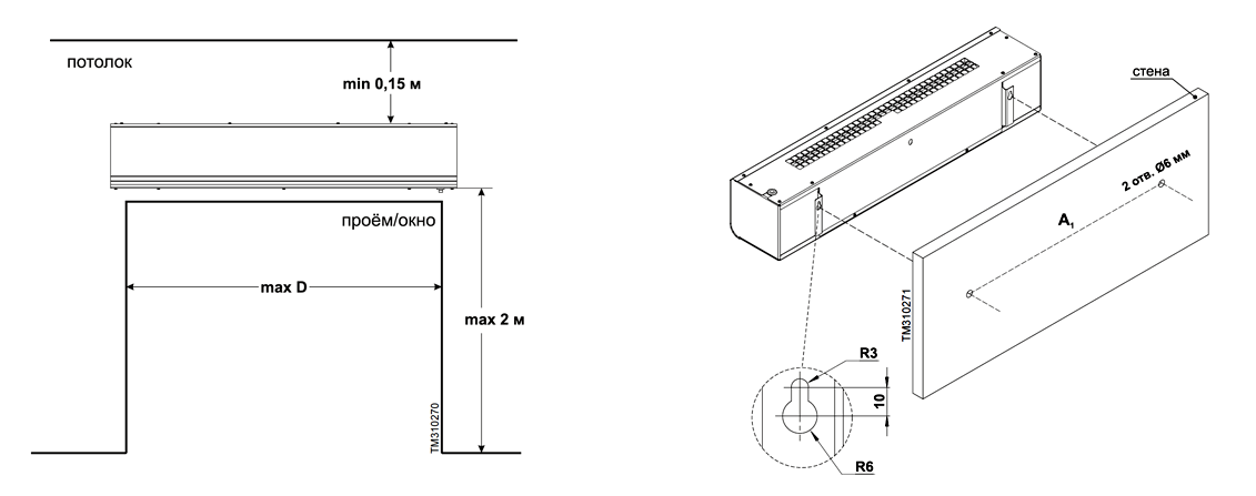 Эффективная длина струи может служить оценкой допустимой ширины или высоты проема, который защищает завеса. При вертикальной установке завес с двух сторон проема, значение, следует понимать как полуширину. Параметр указан только для "мягких" наружных условий, т.е. температура воздуха не опускается ниже 0 °С, а скорость ветра не превышает 1м/с, приточно-вытяжная вентиляция сбалансирована. Любое ужесточение условий уменьшает эффективную длину струи на 50%.
