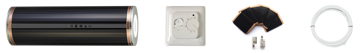 Готовый комплект инфракрасного пленочного теплого пола с механическим терморегулятором — это простое и экономичное решение по организации комфортного подогрева пола в помещении. Пленка монтируется сухим способом, не требует стяжки, и подходит даже для законченного ремонта. Толщина полотна всего около 0,4 мм и укладывать его можно под ламинат, линолеум, ковролин, паркетную доску.