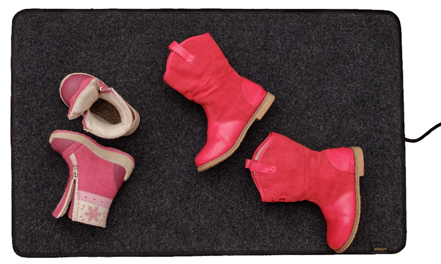 Предназначается для комфортной и быстрой просушки обуви. Нагрев осуществляется при помощи установленного греющего кабеля, который расположен между влагостойкой основы ПВХ и прочным ворсовым грязеудерживающим покрытием. Максимальная температура нагрева достигает 40 °С. Для активной работы достаточно включить евровилку в розетку. Степень пылевлагозащиты IP67. Экономичен в потреблении электроэнергии - 70 Вт/час.