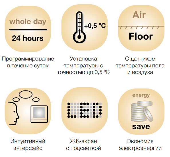 Программирование температурных режимов на каждый час в течение суток. Интуитивный интерфейс. Встроенный датчик температуры воздуха. Датчик температуры пола в комплекте. ЖК-дисплей с подсветкой. Возможность установки коридора температур. Автоматическое под