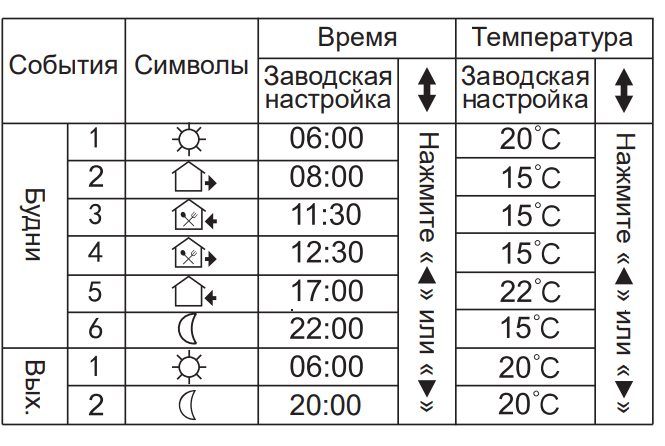 • Временно ручной режим — терморегулятор временно поддерживает заданную вручную температуру, к моменту следующего события возвращается к программным настройкам.
